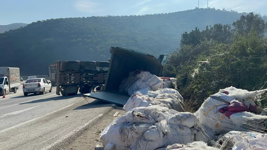 Bursa'nın İznik ilçesinde kontrolden çıkan cam elyaf yüklü bir kamyon, bariyerleri aşarak yan yattı. Kazada araç içerisinde bulunan 3 kişi yaralandı.