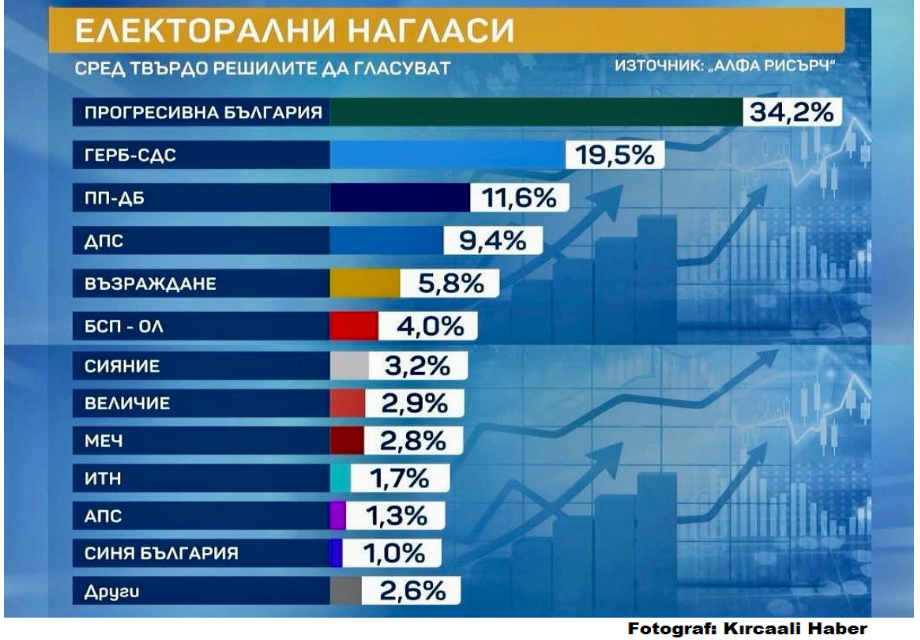 Alpha Research kamuoyu araştırma şirketinin 52. dönem Parlamento seçimlerine yönelik paylaştığı son veriler, Bulgaristan siyasetinde dengelerin değiştiğini gösteriyor. Ankete göre "Progresivna Bulgariya" (İlerici Bulgaristan), en yakın rakibine yaklaşık 15 puan fark atarak sandıktan birinci parti çıkıyor.