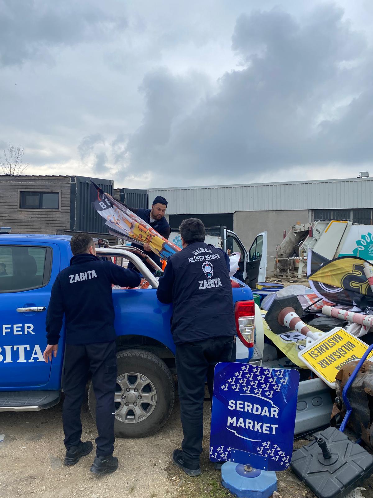 Nilüfer Belediyesi kent estetiğini bozan, yaya geçişini engelleyen, görüntü ve çevre kirliliği oluşturan tabelalarla ilgili çalışma gerçekleştirdi. Zabıta ekipleri, 29 Ekim Mahallesi’nde; Özlüce Bulvarı, Uğur Mumcu Bulvarı, Muammer Aksoy Caddesi, Beşevler Mahallesi’nde; Beşevler Caddesi, Bilginer Caddesi, Mihraplı Caddesi ve Görükle Mahallesi’nde; Atatürk Caddesi, Atatürk Bulvarı, Anafartalar Caddesi, Pamukkale Caddesi, Cevizlik Caddesi’nde denetim yaptı. Söz konusu bölgelerde izinsiz bir şekilde konulan duba, bayrak, reklam tabelalar toplandı. Yaya ve engelli yollarını engelleyen materyaller araçlara yüklendi. Toplanan malzemeler, işlemler tamamlandıktan sonra belirlenen alanlara taşındı.