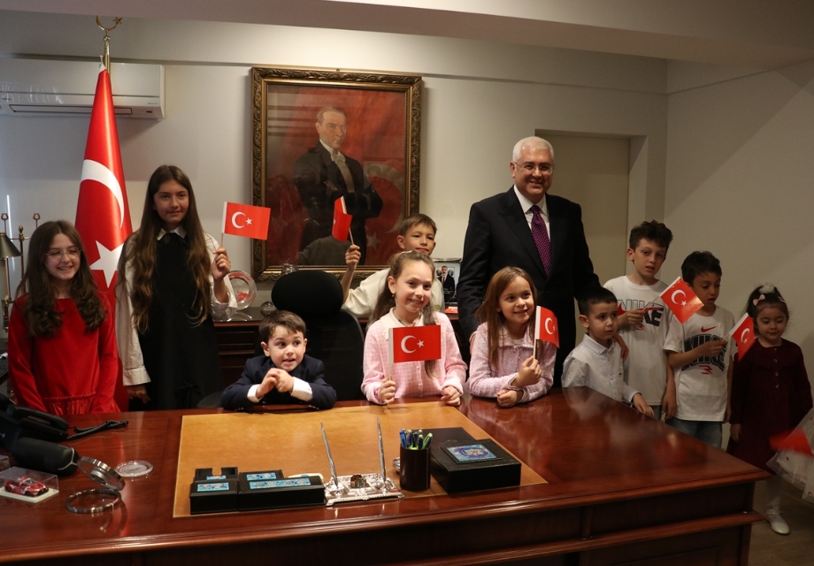 Tören kapsamında çocuklar tek tek Büyükelçi Uyanık’ın makam koltuğuna oturdu.